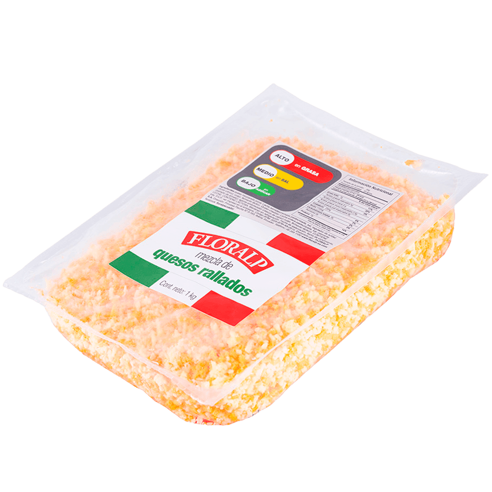 Mozzarella: Leche descremada pasteurizada, regulador de acidez, agente endurecedor. Cheddar: Leche entera pasteurizada, cuajo, fermento láctico.