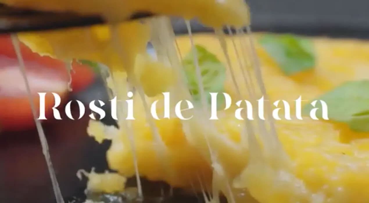 Pelamos las papas y las cocinamos en agua. Rallamos las papas cocinadas y el queso Mountyer Floralp y mezclamos bien ambos ingredientes. En un sartén colocamos 1 cda. de mantequilla Floralp dejando que se derrita por todo el sartén. Luego colocamos la mezcla de queso Mountyer Floralp y papas ralladas, comprimiéndolos en el sartén. Cuando esté dorada de un lado, le damos la vuelta para dorar el otro. Servimos el Rosti de Patata y Queso acompañado de tomates cherry, hojas de albahaca y un chorrito de aceite de oliva.